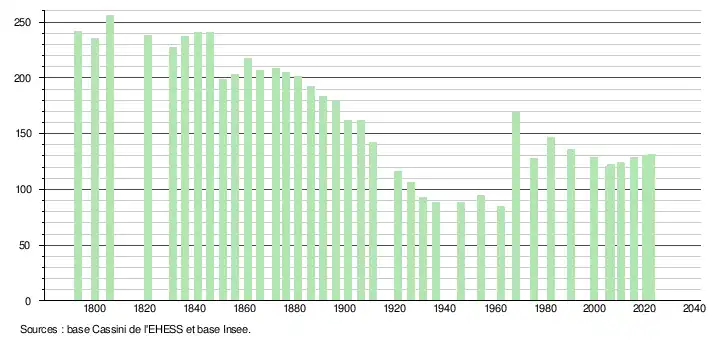 L'évolution du nombre d'habitants est connue à travers les recensements de la population effectués dans la commune depuis 1793. Pour les communes de moins de 10 000 habitants, une enquête de recensement portant sur toute la population est réalisée tous les cinq ans, les populations de référence des années intermédiaires étant quant à elles estimées par interpolation ou extrapolation[29]. Pour la commune, le premier recensement exhaustif entrant dans le cadre du nouveau dispositif a été réalisé en 2005[30].