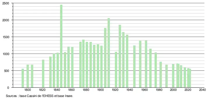 L'évolution du nombre d'habitants est connue à travers les recensements de la population effectués dans la commune depuis 1793. Pour les communes de moins de 10 000 habitants, une enquête de recensement portant sur toute la population est réalisée tous les cinq ans, les populations de référence des années intermédiaires étant quant à elles estimées par interpolation ou extrapolation[27]. Pour la commune, le premier recensement exhaustif entrant dans le cadre du nouveau dispositif a été réalisé en 2005[28].