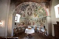 L'église de montagne de Fex-Crasta a été construite à la fin du XVe siècle et placée sous le patronage de sainte Marguerite d'Antioche. En 1511, l'abside fut entièrement peinte par un maître inconnu de l'Italie du Nord : au milieu Dieu le Père, devant lui le crucifié et la colombe du Saint-Esprit, le tout entouré d'une mandorle et des quatre symboles évangéliques. À gauche, sont représentées trois saintes vierges et martyres devant Marie avec l'Enfant. Sur la droite se trouve la Vierge de Lorette, une image votive, avec l'inscription du donateur en dessous[2]. Dès 1522, le val Fex approuva la Réforme protestante, de sorte que l'édifice sacré devint une église prêcheuse réformée. Les fresques ont été victimes de la furie iconoclaste et ont été complètement blanchies à la chaux. Dans les années 1820, elles ont été découvertes et restaurées.