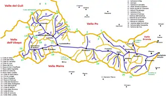 - la vallée de la Varaita de Bellino au sud est orientée nord-est-sud-ouest et mène à la brèche de l'Autaret (de l'autre côté, en France, se trouve la vallée de l'Ubaye).