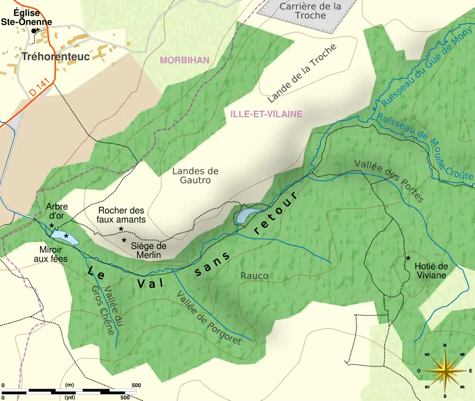 - ↑ M. Cayot Delandre cite le Val sans retour dans le chapitre consacré à Tréhorenteuc, dans le livre Le Morbihan, son histoire et ses monuments paru en 1847. Le Dictionnaire historique et géographique de la province de Bretagne, paru en 1853, place le Val sans retour près de Tréhorenteuc et non plus de Paimpont.