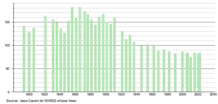 - ↑ Population municipale de référence en vigueur au 1er janvier 2025, millésimée 2022, définie dans les limites territoriales en vigueur au 1er janvier 2024, date de référence statistique : 1er janvier 2022.