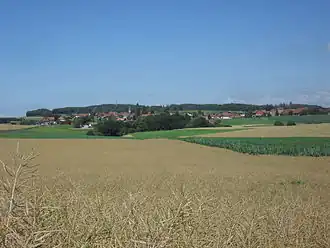 Vue de la vallée de la Broye depuis Villarzel, avec Granges-près-Marnand au centre et Sassel en haut à gauche. | ||||