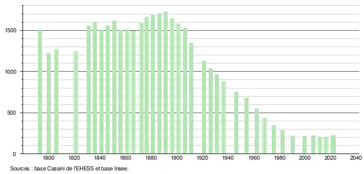 L'évolution du nombre d'habitants est connue à travers les recensements de la population effectués dans la commune depuis 1793. Pour les communes de moins de 10 000 habitants, une enquête de recensement portant sur toute la population est réalisée tous les cinq ans, les populations de référence des années intermédiaires étant quant à elles estimées par interpolation ou extrapolation[16]. Pour la commune, le premier recensement exhaustif entrant dans le cadre du nouveau dispositif a été réalisé en 2006[17].