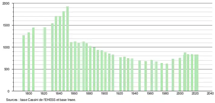 L'évolution du nombre d'habitants est connue à travers les recensements de la population effectués dans la commune depuis 1793. Pour les communes de moins de 10000habitants, une enquête de recensement portant sur toute la population est réalisée tous les cinqans, les populations de référence des années intermédiaires étant quant à elles estimées par interpolation ou extrapolation[29]. Pour la commune, le premier recensement exhaustif entrant dans le cadre du nouveau dispositif a été réalisé en 2005[30].