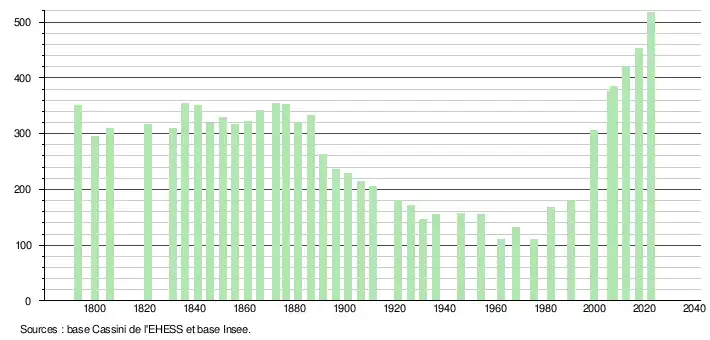 L'évolution du nombre d'habitants est connue à travers les recensements de la population effectués dans la commune depuis 1793. Pour les communes de moins de 10 000 habitants, une enquête de recensement portant sur toute la population est réalisée tous les cinq ans, les populations de référence des années intermédiaires étant quant à elles estimées par interpolation ou extrapolation[21]. Pour la commune, le premier recensement exhaustif entrant dans le cadre du nouveau dispositif a été réalisé en 2007[22].
