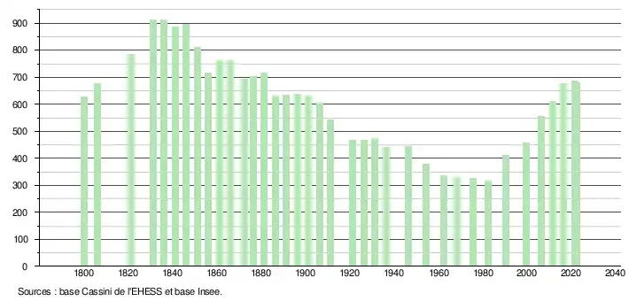 L'évolution du nombre d'habitants est connue à travers les recensements de la population effectués dans la commune depuis 1800. Pour les communes de moins de 10 000 habitants, une enquête de recensement portant sur toute la population est réalisée tous les cinq ans, les populations de référence des années intermédiaires étant quant à elles estimées par interpolation ou extrapolation[37]. Pour la commune, le premier recensement exhaustif entrant dans le cadre du nouveau dispositif a été réalisé en 2006[38].