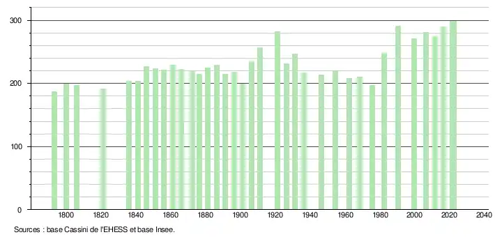 L'évolution du nombre d'habitants est connue à travers les recensements de la population effectués dans la commune depuis 1793. Pour les communes de moins de 10 000 habitants, une enquête de recensement portant sur toute la population est réalisée tous les cinq ans, les populations de référence des années intermédiaires étant quant à elles estimées par interpolation ou extrapolation[21]. Pour la commune, le premier recensement exhaustif entrant dans le cadre du nouveau dispositif a été réalisé en 2006[22].