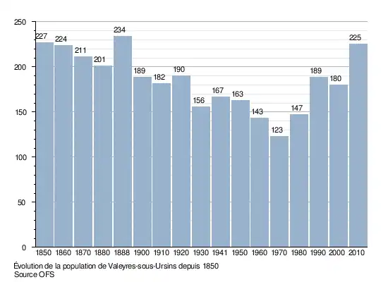 Le graphique suivant résume l'évolution de la population de Valeyres-sous-Ursins entre 1850 et 2010[10] :
