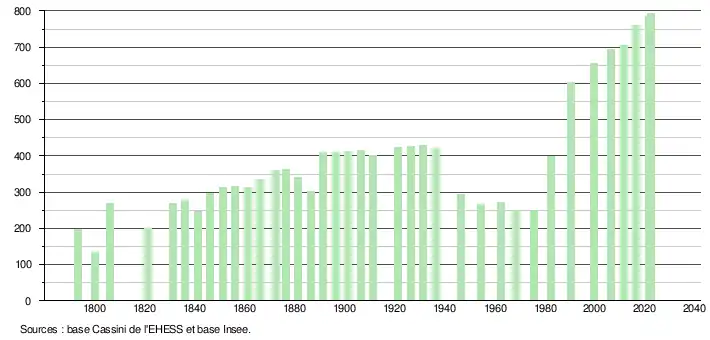 L'évolution du nombre d'habitants est connue à travers les recensements de la population effectués dans la commune depuis 1793. Pour les communes de moins de 10 000 habitants, une enquête de recensement portant sur toute la population est réalisée tous les cinq ans, les populations de référence des années intermédiaires étant quant à elles estimées par interpolation ou extrapolation[29]. Pour la commune, le premier recensement exhaustif entrant dans le cadre du nouveau dispositif a été réalisé en 2006[30].
