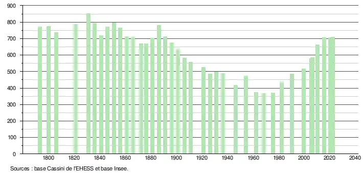 L'évolution du nombre d'habitants est connue à travers les recensements de la population effectués dans la commune depuis 1793. Pour les communes de moins de 10 000 habitants, une enquête de recensement portant sur toute la population est réalisée tous les cinq ans, les populations de référence des années intermédiaires étant quant à elles estimées par interpolation ou extrapolation[15]. Pour la commune, le premier recensement exhaustif entrant dans le cadre du nouveau dispositif a été réalisé en 2005[16].