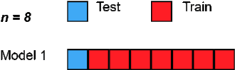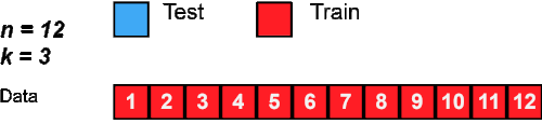 Pour la validation croisée à blocs, « k-fold cross-validation », on divise l'échantillon original en échantillons (ou « blocs »), puis on sélectionne un des échantillons comme ensemble de validation pendant que les autres échantillons constituent l'ensemble d'apprentissage. Après apprentissage, on peut calculer une performance de validation. Puis on répète l'opération en sélectionnant un autre échantillon de validation parmi les blocs prédéfinis. À l'issue de la procédure nous obtenons ainsi scores de performances, un par bloc. La moyenne et l'écart type des scores de performances peuvent être calculés pour estimer le biais et la variance de la performance de validation.
