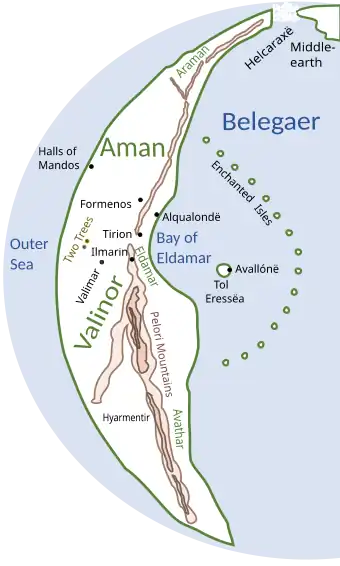 Dans les temps anciens, lorsque Melkor détruisit les Lampes des Valar qui éclairaient le monde d'Arda, le désastre toucha aussi la première demeure des autres Ainur, les Valar, sur l'île d'Almaren (au centre du monde d'Arda) qui fut également détruite. Ceux-ci cherchèrent alors un nouvel endroit où habiter, et s'établirent finalement dans la région de Valinor à Aman, à l’extrême-ouest d'Arda.