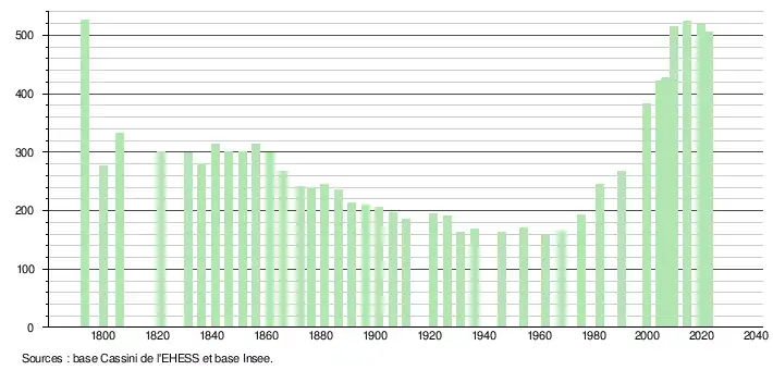 L'évolution du nombre d'habitants est connue à travers les recensements de la population effectués dans la commune depuis 1793. Pour les communes de moins de 10 000 habitants, une enquête de recensement portant sur toute la population est réalisée tous les cinq ans, les populations de référence des années intermédiaires étant quant à elles estimées par interpolation ou extrapolation[26]. Pour la commune, le premier recensement exhaustif entrant dans le cadre du nouveau dispositif a été réalisé en 2004[27].