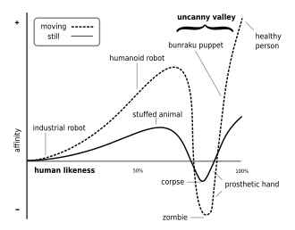 - Les mouvements plus lents qu'un humain, ou plus réguliers qu'un humain. De manière plus générale, c'est la discordance entre la perception de ce qui fait l'action (par exemple, un androïde ayant l'apparence humaine) et l'action réalisée (des mouvements robotiques et non naturels) qui crée cette vallée dérangeante : un robot qui bouge comme un robot, ou un humain qui bouge comme un humain ne posent pas de problème, mais un androïde agissant comme un humain est perturbant pour le traitement cognitif qui ne sait plus classer ce qu'il voit entre robot et humain[5].