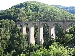 Malgré un encaissement important et un accès malaisé, la vallée est suivie par une petite route ainsi que, depuis le XIXe siècle, par la ligne de chemin de fer de Béziers à Neussargues qui a nécessité la construction d'ouvrages d'art comme le viaduc de l'Enfer[2]. Le choix fait à l'époque d'emprunter cette vallée s'explique par la grande différence d'altitude qui existe entre la gare d'Aumont-Aubrac (1 000 m) au nord et celle de Marvejols (680 m) au sud. Pour perdre de l'altitude progressivement, le passage par le versant ouest de la vallée s'est imposé en dépit de la nécessité de réaliser plusieurs tunnels et ponts.