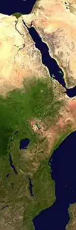 En réalité, l'ensemble de la faille tectonique s'étire en Afrique et en Asie mineure sur environ 7 000 kilomètres du nord au sud, et 30 à 100 km de largeur, du Liban jusqu'au Mozambique, en passant par la mer Rouge et les grands lacs africains[3]. Elle coupe en deux la Corne de l'Afrique : la plaque somalienne, à l'est, s'éloigne de la plaque africaine, à l'ouest. Elle se divise, au sud de l'Éthiopie, de part et d'autre de l'Ouganda. La branche occidentale (rift Albertin) s'échelonne le long des grands lacs africains, formés par l'accumulation de l'eau dans les dépressions de faille, tandis que la branche orientale (rift de Gregory) traverse le Kenya et la Tanzanie à l'est du lac Victoria, où elle forme un chapelet de lacs plus petits.