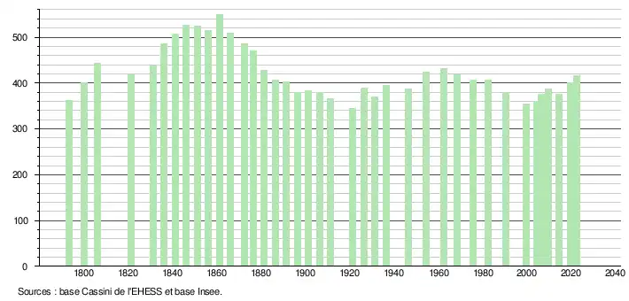 L'évolution du nombre d'habitants est connue à travers les recensements de la population effectués dans la commune depuis 1793. Pour les communes de moins de 10 000 habitants, une enquête de recensement portant sur toute la population est réalisée tous les cinq ans, les populations de référence des années intermédiaires étant quant à elles estimées par interpolation ou extrapolation[24]. Pour la commune, le premier recensement exhaustif entrant dans le cadre du nouveau dispositif a été réalisé en 2004[25].