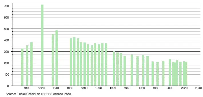 L'évolution du nombre d'habitants est connue à travers les recensements de la population effectués dans la commune depuis 1793. Pour les communes de moins de 10 000 habitants, une enquête de recensement portant sur toute la population est réalisée tous les cinq ans, les populations de référence des années intermédiaires étant quant à elles estimées par interpolation ou extrapolation[19]. Pour la commune, le premier recensement exhaustif entrant dans le cadre du nouveau dispositif a été réalisé en 2004[20].