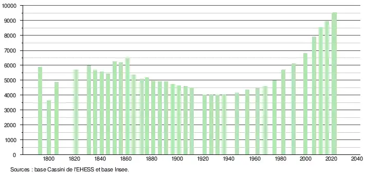 L'évolution du nombre d'habitants est connue à travers les recensements de la population effectués dans la commune depuis 1793. Pour les communes de moins de 10 000 habitants, une enquête de recensement portant sur toute la population est réalisée tous les cinq ans, les populations de référence des années intermédiaires étant quant à elles estimées par interpolation ou extrapolation[18]. Pour la commune, le premier recensement exhaustif entrant dans le cadre du nouveau dispositif a été réalisé en 2006[19].