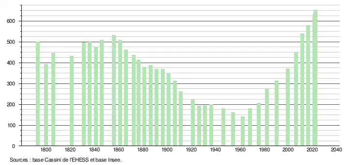 L'évolution du nombre d'habitants est connue à travers les recensements de la population effectués dans la commune depuis 1793. Pour les communes de moins de 10 000 habitants, une enquête de recensement portant sur toute la population est réalisée tous les cinq ans, les populations de référence des années intermédiaires étant quant à elles estimées par interpolation ou extrapolation[25]. Pour la commune, le premier recensement exhaustif entrant dans le cadre du nouveau dispositif a été réalisé en 2006[26].