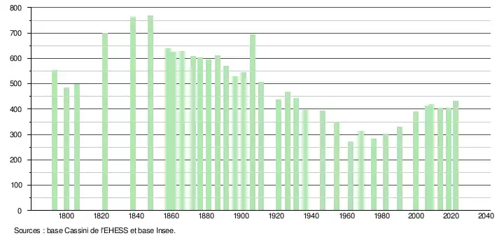 L'évolution du nombre d'habitants est connue à travers les recensements de la population effectués dans la commune depuis 1793. Pour les communes de moins de 10 000 habitants, une enquête de recensement portant sur toute la population est réalisée tous les cinq ans, les populations de référence des années intermédiaires étant quant à elles estimées par interpolation ou extrapolation[19]. Pour la commune, le premier recensement exhaustif entrant dans le cadre du nouveau dispositif a été réalisé en 2008[20].