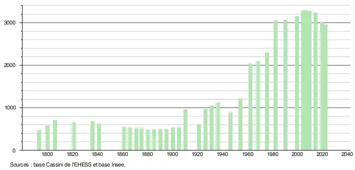 L'évolution du nombre d'habitants est connue à travers les recensements de la population effectués dans la commune depuis 1793. Pour les communes de moins de 10 000 habitants, une enquête de recensement portant sur toute la population est réalisée tous les cinq ans, les populations de référence des années intermédiaires étant quant à elles estimées par interpolation ou extrapolation[26]. Pour la commune, le premier recensement exhaustif entrant dans le cadre du nouveau dispositif a été réalisé en 2004[27].