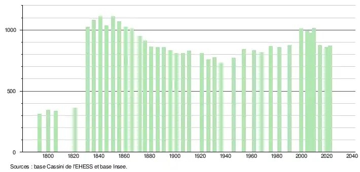 L'évolution du nombre d'habitants est connue à travers les recensements de la population effectués dans la commune depuis 1793. Pour les communes de moins de 10 000 habitants, une enquête de recensement portant sur toute la population est réalisée tous les cinq ans, les populations de référence des années intermédiaires étant quant à elles estimées par interpolation ou extrapolation[31]. Pour la commune, le premier recensement exhaustif entrant dans le cadre du nouveau dispositif a été réalisé en 2004[32].