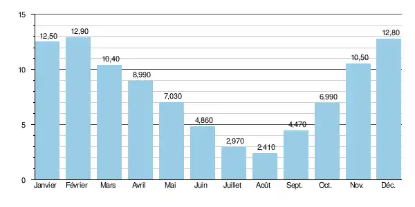 Sur cette période d'observation, le débit journalier maximal a été observé le pour 122 m3/s. Le débit instantané maximal a été observé le [note 4] avec 151,0 m3/s en même temps que la hauteur maximale instantanée de 142 cm soit 1,42 m[2].