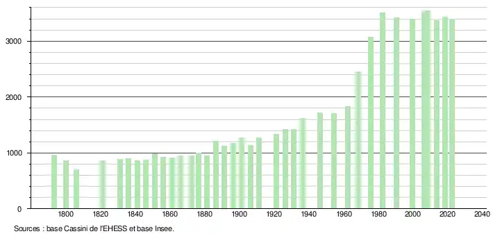 L'évolution du nombre d'habitants est connue à travers les recensements de la population effectués dans la commune depuis 1793. Pour les communes de moins de 10 000 habitants, une enquête de recensement portant sur toute la population est réalisée tous les cinq ans, les populations de référence des années intermédiaires étant quant à elles estimées par interpolation ou extrapolation[25]. Pour la commune, le premier recensement exhaustif entrant dans le cadre du nouveau dispositif a été réalisé en 2008[26].