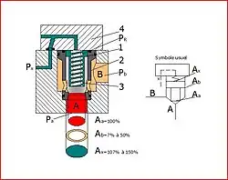 Le bloc foré fait office de corps de valve et comporte les orifices principaux -A- et -B- ainsi que les canaux de pilotage. L’étanchéité entre les orifices -A- et -B- est réalisée par le clapet qui s’appuie sur un siège usiné dans la chemise. L’ouverture ou la fermeture du passage entre les orifices -A- et -B- est liée au déplacement vers le haut du clapet, c'est-à-dire aux pressions (ou force) qui agissent sur les sections Aa, Ab, Ax et de la force du ressort Fr.