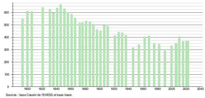 L'évolution du nombre d'habitants est connue à travers les recensements de la population effectués dans la commune depuis 1793. Pour les communes de moins de 10 000 habitants, une enquête de recensement portant sur toute la population est réalisée tous les cinq ans, les populations de référence des années intermédiaires étant quant à elles estimées par interpolation ou extrapolation[27]. Pour la commune, le premier recensement exhaustif entrant dans le cadre du nouveau dispositif a été réalisé en 2005[28].