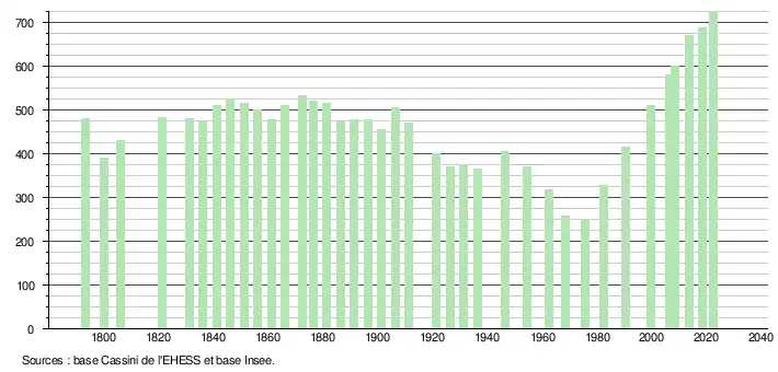L'évolution du nombre d'habitants est connue à travers les recensements de la population effectués dans la commune depuis 1793. Pour les communes de moins de 10 000 habitants, une enquête de recensement portant sur toute la population est réalisée tous les cinq ans, les populations de référence des années intermédiaires étant quant à elles estimées par interpolation ou extrapolation[14]. Pour la commune, le premier recensement exhaustif entrant dans le cadre du nouveau dispositif a été réalisé en 2008[15].