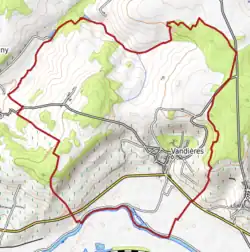 Le village de Vandières est situé au sud-est de la commune[Carte 1], au début des coteaux de la Montagne de Reims[21]. Le hameau de Trotte est situé au nord-ouest de la commune[Carte 1], sur le plateau dominant la vallée de la Brandouille[21]. Le village et Trotte prennent historiquement la forme de villages-rue[21]. Le village a une morphologie typique des villages viticoles de la région[22], avec un bâti dense et des rues étroites et sinueuses[23].