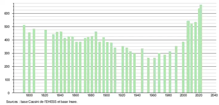 L'évolution du nombre d'habitants est connue à travers les recensements de la population effectués dans la commune depuis 1793. Pour les communes de moins de 10 000 habitants, une enquête de recensement portant sur toute la population est réalisée tous les cinq ans, les populations de référence des années intermédiaires étant quant à elles estimées par interpolation ou extrapolation[14]. Pour la commune, le premier recensement exhaustif entrant dans le cadre du nouveau dispositif a été réalisé en 2005[15].