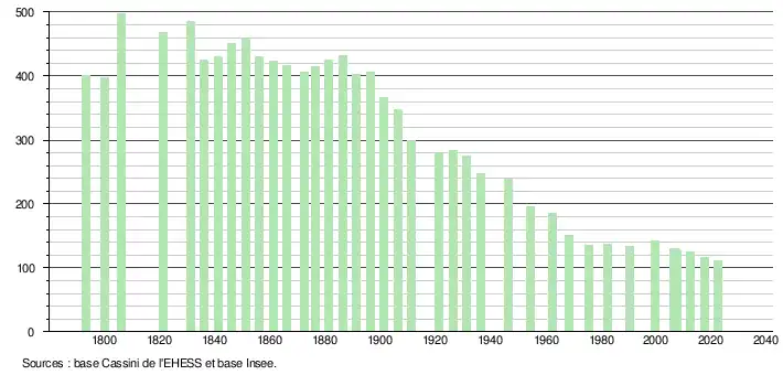 L'évolution du nombre d'habitants est connue à travers les recensements de la population effectués dans la commune depuis 1793. Pour les communes de moins de 10 000 habitants, une enquête de recensement portant sur toute la population est réalisée tous les cinq ans, les populations de référence des années intermédiaires étant quant à elles estimées par interpolation ou extrapolation[14]. Pour la commune, le premier recensement exhaustif entrant dans le cadre du nouveau dispositif a été réalisé en 2007[15].