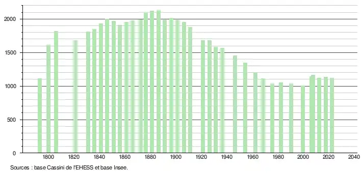 L'évolution du nombre d'habitants est connue à travers les recensements de la population effectués dans la commune depuis 1793. Pour les communes de moins de 10 000 habitants, une enquête de recensement portant sur toute la population est réalisée tous les cinq ans, les populations de référence des années intermédiaires étant quant à elles estimées par interpolation ou extrapolation[21]. Pour la commune, le premier recensement exhaustif entrant dans le cadre du nouveau dispositif a été réalisé en 2007[22].