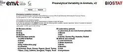 La phase préanalytique est soumise à de très nombreuses causes de variation susceptibles d’affecter les résultats des analyses, comme cela a été répertorié en biologie médicale humaine[7] dans des ouvrages ou articles de synthèse ou en pathologie clinique animale dans des articles de synthèse[8],[9],[10] ou une base de données interrogeable par analyte, par espèce et par effet recherché sur un site web gratuit (cf. image ci-contre)[6] ou sur des sites universitaires comme celui de l’Université de Cornell aux USA[11]. En biologie médicale humaine, la phase préanalytique est majoritairement contrôlée par les personnels professionnels des laboratoires de biologie médicale ; malgré cela, on considère qu’elle est responsable de la majorité des erreurs de laboratoire[12] bien que des efforts internationaux soient faits pour les réduire[13],[14]. La situation est plus difficile en pathologie clinique vétérinaire où la phase préanalytique doit s’adapter à des conditions très variées, depuis un hôpital vétérinaire aux conditions voisines de la biologie médicale humaine jusqu’à des élevages en plein air, des zoos, des centres de recherches, la mer, des environnements divers pour les animaux sauvages.