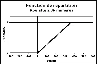 Il serait possible d'introduire cette notion à partir de l'une quelconque des variables précédemment considérées mais il paraît plus clair d'étudier le cas du dé sous un angle différent. En effet, il définit une variable aléatoire X qui prend avec la même probabilité d'apparition (1/6) des valeurs dans l'ensemble {1,2,3,4,5,6}. On peut alors associer à toute valeur réelle x la probabilité d'obtenir un tirage inférieur ou égal à x, ce qui définit une courbe en escalier dont les marches ont une hauteur égale à 1/6.