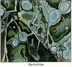 La variolite, du latin « variola » est une variété de basalte de couleur vert sombre, dont le relief présente de petits boutons blanchâtres en forme de pustules qui lui a valu son nom, attribué par le géologue et minéralogiste Alexandre Brongniart (1770-1847) (directeur de la Manufacture de Sèvres). Les basaltes sont des roches volcaniques.