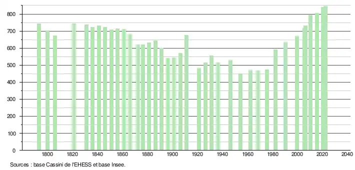 L'évolution du nombre d'habitants est connue à travers les recensements de la population effectués dans la commune depuis 1793. Pour les communes de moins de 10 000 habitants, une enquête de recensement portant sur toute la population est réalisée tous les cinq ans, les populations de référence des années intermédiaires étant quant à elles estimées par interpolation ou extrapolation[16]. Pour la commune, le premier recensement exhaustif entrant dans le cadre du nouveau dispositif a été réalisé en 2005[17].