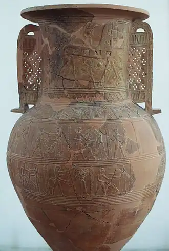 Le vase de Mykonos, un pithos, est l'un des premiers objets datés (Époque archaïque, vers ) à représenter le cheval de Troie qui apparaît dans le récit d'Homère sur la chute de Troie, pendant la guerre de Troie dans l'Odyssée[a].