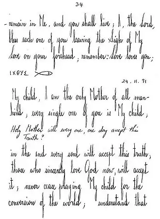 « On parle entre autres choses avec un langage ambigu des Personnes de la Très Sainte Trinité, jusqu’à confondre les noms et les fonctions spécifiques des Personnes divines. On annonce, dans ces présumées révélations, une période imminente de suprématie de l’Antéchrist au sein de l’Église. On prophétise dans une optique millénariste, une intervention définitive et glorieuse de Dieu qui instaurerait sur la terre, avant même la venue définitive du Christ, une ère de paix et de bien-être universel. On annonce de plus la venue prochaine d’une Église qui serait une sorte de communauté panchrétienne, en contradiction avec la doctrine catholique. »
