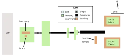 L’ensemble est orienté selon un axe est-ouest, et depuis la plaine, escalade le flanc de la montagne pour aboutir au sanctuaire, situé sur une terrasse au pied de la falaise où coule la source sacrée. Le site commence avec deux barays (lacs artificiels), ensuite une allée de grès jalonné de bornes mène aux deux grands palais (nord et sud). Une route ancienne surélevée conduit au temple de Nang Sida et continuait autrefois vers Angkor.