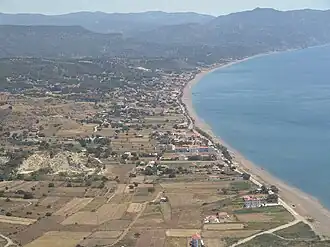 La plage offre une vue sur Chios, Psara et la Turquie, tandis qu'à trois kilomètres au sud-ouest du village balnéaire se trouve le cap d'Ágios Fokás, où sont encore conservées les ruines d'un temple de Dionysos et d'une basilique du début de l'ère chrétienne[4].