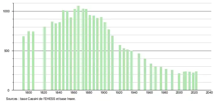 L'histoire démographique de la commune présente un décalage par rapport à l'évolution de la population dans la plupart des localités rurales de la région depuis deux siècles. Cette évolution s'est déroulée ailleurs le plus souvent en trois phases ; la première couvrant la période 1800-1850 ou 1800-1875 marquée par une forte croissance de la population, la seconde généralement longue d'un siècle caractérisée par une érosion démographique importante parfois spectaculaire, la troisième qui a vu une notable reprise de la croissance depuis les plus récentes décennies.