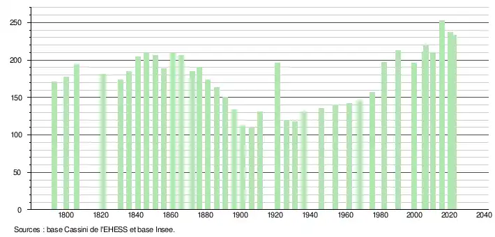 L'évolution du nombre d'habitants est connue à travers les recensements de la population effectués dans la commune depuis 1793. Pour les communes de moins de 10 000 habitants, une enquête de recensement portant sur toute la population est réalisée tous les cinq ans, les populations de référence des années intermédiaires étant quant à elles estimées par interpolation ou extrapolation[26]. Pour la commune, le premier recensement exhaustif entrant dans le cadre du nouveau dispositif a été réalisé en 2005[27].