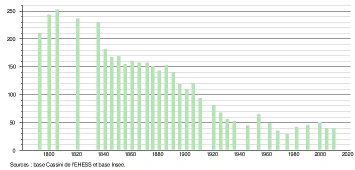 - ↑ Par convention dans Wikipédia, le principe a été retenu de n’afficher dans le tableau des recensements et le graphique, pour les populations légales postérieures à 1999, que les populations correspondant à une enquête exhaustive de recensement pour les communes de moins de 10 000 habitants, et que les populations des années 2006, 2011, 2016, etc. pour les communes de plus de 10 000 habitants, ainsi que la dernière population légale publiée par l’Insee pour l'ensemble des communes.