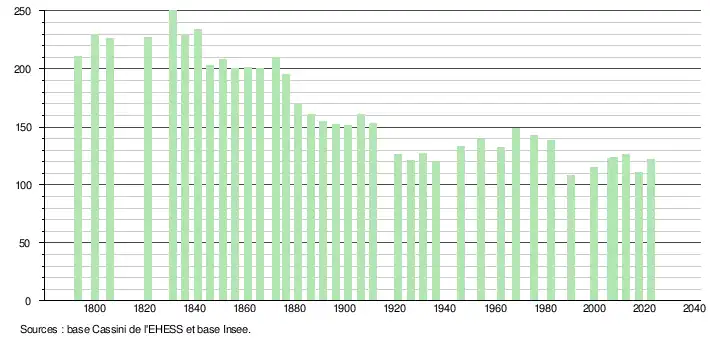 L'évolution du nombre d'habitants est connue à travers les recensements de la population effectués dans la commune depuis 1793. Pour les communes de moins de 10 000 habitants, une enquête de recensement portant sur toute la population est réalisée tous les cinq ans, les populations de référence des années intermédiaires étant quant à elles estimées par interpolation ou extrapolation[18]. Pour la commune, le premier recensement exhaustif entrant dans le cadre du nouveau dispositif a été réalisé en 2007[19].