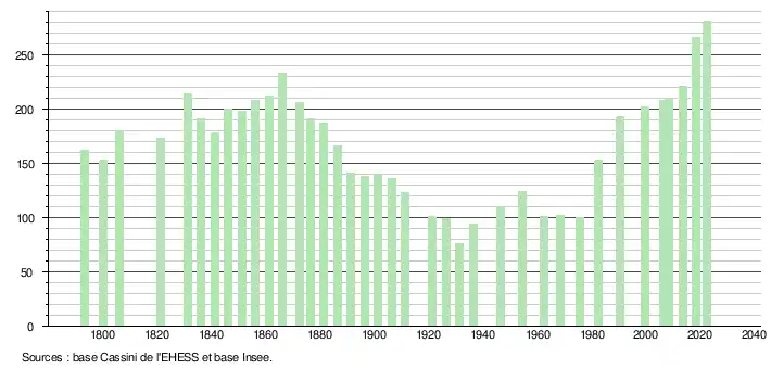 L'évolution du nombre d'habitants est connue à travers les recensements de la population effectués dans la commune depuis 1793. Pour les communes de moins de 10 000 habitants, une enquête de recensement portant sur toute la population est réalisée tous les cinq ans, les populations de référence des années intermédiaires étant quant à elles estimées par interpolation ou extrapolation[45]. Pour la commune, le premier recensement exhaustif entrant dans le cadre du nouveau dispositif a été réalisé en 2008[46].